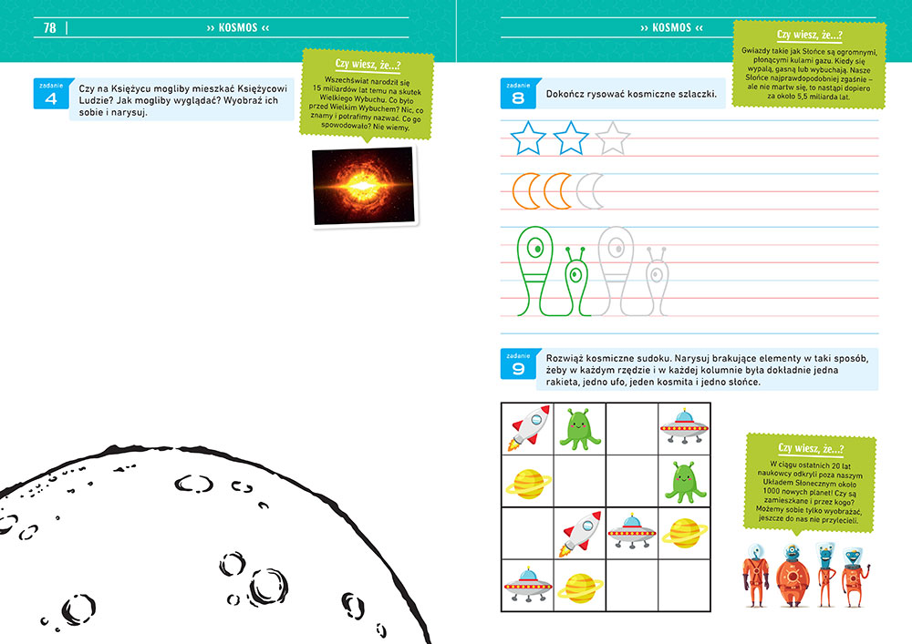 Je¶li Wasze dzieci zastanawia³y siê nad tym choæ raz, to ta ksi±¿ka jest w³a¶nie dla nich! W ¶rodku znajduj± siê liczne zagadki, ³amig³ówki, labirynty, kodowanie, wyszukiwanki i mnóstwo innych typów zadañ, uwielbianych przez dzieci. Dodatkowo zadania wzbogacone zosta³y licznymi ciekawostkami o zwierzêtach, kosmosie, cz³owieku, dinozaurach... Z tej ksi±¿ki mo¿na siê naprawdê wiele dowiedzieæ, fantastycznie siê przy tym bawi±c!
