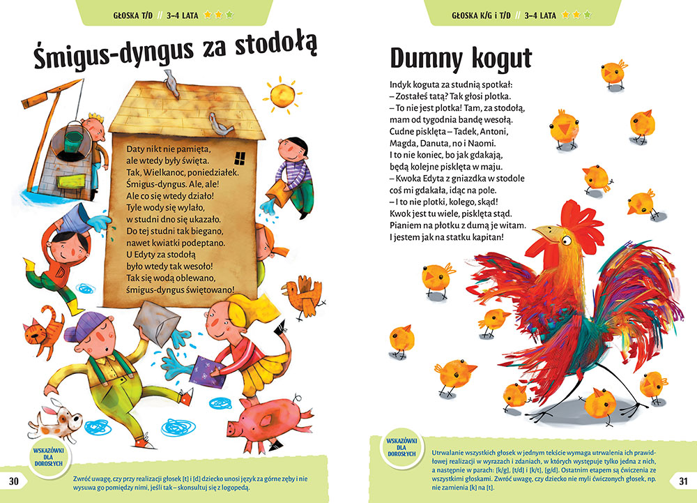 Trzeba przyznaæ, ¿e niektóre ze wspomnianych porad dla rodziców s± bardzo kreatywne! Z pewno¶ci± podsun± Wam kilka pomys³ów na ciekawe zabawy logopedyczne, które mo¿na realizowaæ z dzieckiem w domu, na spacerze, w trakcie czynno¶ci pielêgnacyjnych, masa¿yków czy innych rodzinnych rytua³ów (...) Dodatkowym atutem ksi±¿ki s± te¿ zabawne ilustracje Artura Gulewicza - bardzo kolorowe i charakterystyczne, zachêcaj±ce dziecko do rozmów na temat wierszy oraz opowiadania o tym, co mo¿na dostrzec na obrazku. Wszystko to razem wziête sprawia, ¿e ksi±¿eczka ma niezwykle aktywizuj±cy charakter (...)