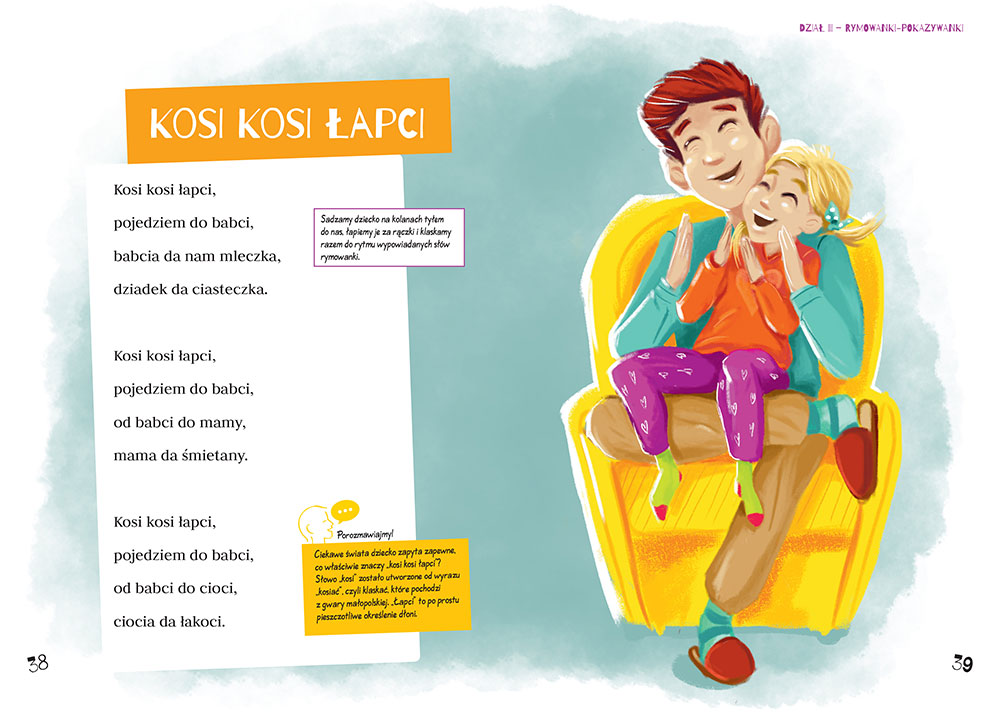 Książeczka zawiera nie tylko znane zabawy paluszkowe, ale również kilka tzw. wierszyków-masażyków. To specjalne rymowanki, które można łączyć z masażem. Należą do nich na przykład utwory takie jak Lata osa koło nosa czy Pisze pani na maszynie. Zabawy z tego typu wierszykami to rewelacyjny sposób na pogłębianie relacji z dzieckiem, rozwijanie jego zmysłu dotyku i poznawanie schematu budowy ciała. Wierszyki są rymowane, dzięki czemu można przy ich pomocy kształtować poczucie rytmu.