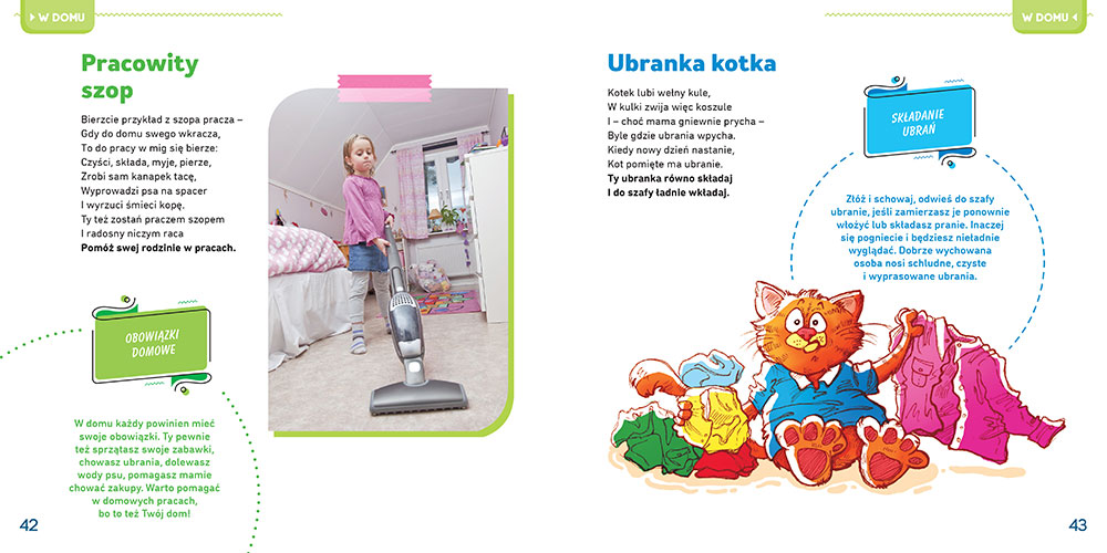 Każdemu wierszykowi towarzyszy kolorowa ilustracja lub zdjęcie oraz komentarz z dodatkowym wyjaśnieniem - nie tylko, jak się zachowywać, ale również dlaczego. Może on stanowić cenną pomoc albo stać się punktem wyjścia do ciekawych rozmów z dzieckiem.