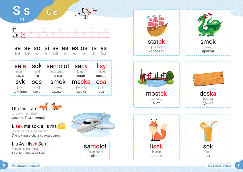 Nie z naszym Moim pierwszym elementarzem polsko-ukraiñskim - dziêki niemu dzieci sprawnie naucz± siê czytaæ po polsku i opanuj± polski alfabet bez problemu! Ka¿d± stronê zaprojektowano tak, by pokazaæ polsk± literkê, sposób jej u¿ycia w sylabach i wyrazach oraz jej wersjê pisan±. Ka¿dy element jêzyka polskiego jest zapisany w jêzyku ukraiñskim, aby mo¿na by³o zrozumieæ jego znaczenie i prawid³owo przeczytaæ. Strony skonstruowane s± wed³ug tego samego schematu, co u³atwia korzystanie z ksi±¿ki.