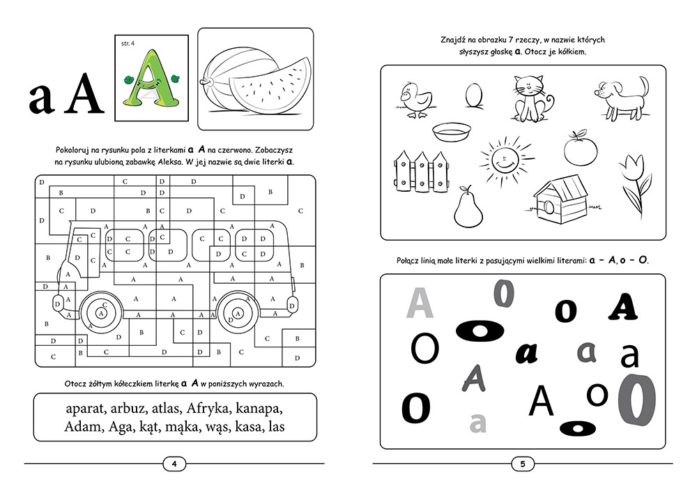 Dzięki różnorodności zadań dziecko się nie nudzi, a nauka przebiega sprawniej i w miłej atmosferze. Mamy tutaj m.in. kolorowanie, szukanie rzeczy z daną literą, labirynty, wykreślanki, odnajdywanie różnic, łączenie w pary, rysowanie, rebusy, łamigłówki oraz rysowanie po śladzie. Jak sami widzicie, zadań jest dużo i mają różny poziom trudności.