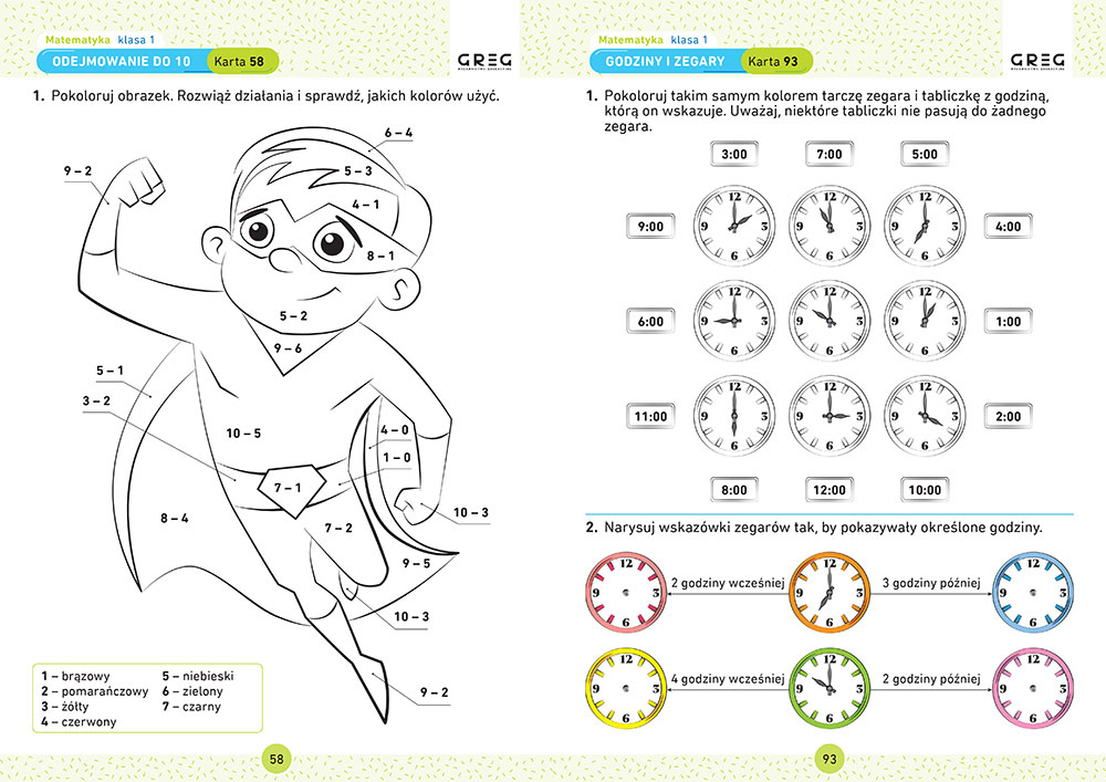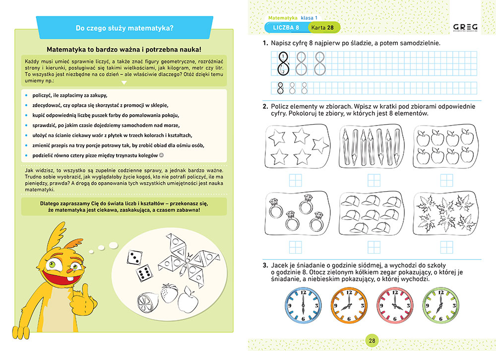 Karty pracy - matematyka, kl. 1 zosta³y przygotowane z wielk± dba³o¶ci± o w³a¶ciwy metodycznie sposób realizacji materia³u. Dlatego te¿ znajduj± siê tutaj g³ównie zadania tekstowe odnosz±ce siê do codziennej rzeczywisto¶ci, a tak¿e zadania graficzne do uzupe³nienia, rysunki, wykresy, grafy itp.
