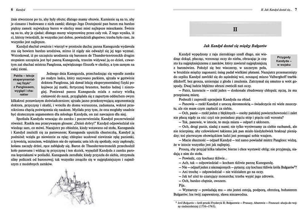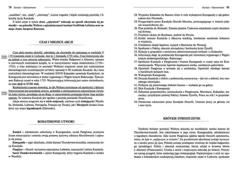 Wydanie Kandyda kompletne bez skrótów i cięć w treści. W tym wydaniu znajdziesz odpowiedzi na pytania z podręcznika - „pewniak na teście”, czyli wskazanie zagadnień, które zwykle pojawiają się w pytaniach z danej lektury we wszelkich testach sprawdzających wiedzę, a także w podręcznikach i na klasówkach. Książka zawiera pełen tekst lektury. Na końcu książki zamieszczono opracowanie, w którym znajduje się bardzo szczegółowe streszczenie oraz drugie skrócone, ułatwiające szybkie przygotowanie się przed lekcją. Opracowanie zawiera ponadto plan wydarzeń, wnikliwie wyjaśnioną problematykę oraz szerokie charakterystyki bohaterów.