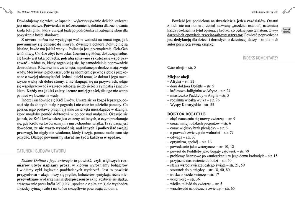 Wydanie Doktora Dolittle i jego zwierząt kompletne bez skrótów i cięć w treści. W tym wydaniu znajdziesz odpowiedzi na pytania z podręcznika - „pewniak na teście”, czyli wskazanie zagadnień, które zwykle pojawiają się w pytaniach z danej lektury we wszelkich testach sprawdzających wiedzę, a także w podręcznikach i na klasówkach. Książka zawiera pełen tekst lektury. Na końcu książki zamieszczono opracowanie, w którym znajduje się bardzo szczegółowe streszczenie oraz drugie skrócone, ułatwiające szybkie przygotowanie się przed lekcją. Opracowanie zawiera ponadto plan wydarzeń, wnikliwie wyjaśnioną problematykę oraz szerokie charakterystyki bohaterów.