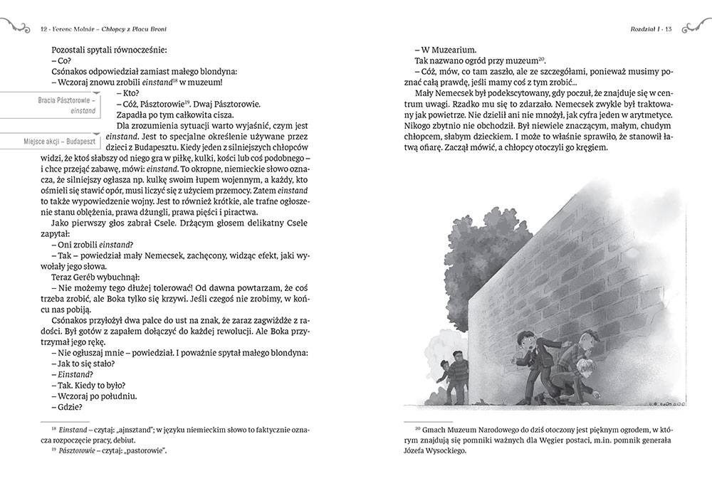 Wydanie Chłopców z Placu Broni od Wydawnictwa Greg to nie tylko nowe tłumaczenie i rzetelne opracowanie, ale także wyjątkowe ilustracje Mikołaja Kamlera. Książkę wyróżnia oryginalny zapis imion, nazwisk i nazw miejscowych oraz towarzyszące mu przypisy z zapisem wymowy, a także nagrania dostępne online, dzięki którym można usłyszeć, jak nazwy własne brzmią po węgiersku.