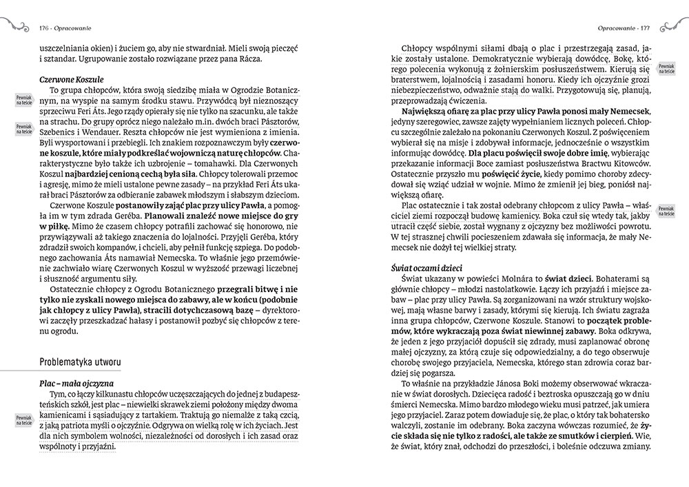 Chłopcy z Placu Broni to książka czytana z zapałem przez wiele pokoleń uczniów. To wyjątkowa opowieść o przyjaźni, poświęceniu w imię idei i niezwykłym przywiązaniu do pewnego niezagospodarowanego budapeszteńskiego placu. Grupa chłopców, szkolnych przyjaciół, spotykała się regularnie w ulubionym miejscu. Mieli przywódcę, Bokę, stopnie wojskowe i prawdziwie żołnierski kodeks moralny. Wśród nich był Nemecsek - niepozorny szeregowiec, drobny i nieśmiały, w którym drzemał ogromny potencjał. Spokój chłopaków z ulicy Pawła zmąciły Czerwone Koszule, grupa chłopców z Ogrodu Botanicznego. Wrogowie, pod wodzą Feriego Átsa, postanowili zdobyć plac - wybuchła wojna... Kto okazał się prawdziwym bohaterem? Kto wygrał?