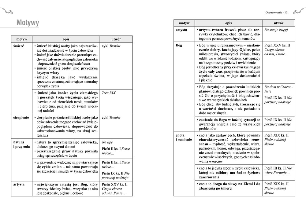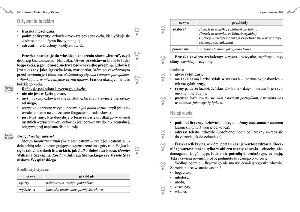 Wydanie Fraszek, Pieśni, Trenów kompletne bez skrótów i cięć w treści. W tym wydaniu znajdziesz odpowiedzi na pytania z podręcznika - „pewniak na teście”, czyli wskazanie zagadnień, które zwykle pojawiają się w pytaniach z danej lektury we wszelkich testach sprawdzających wiedzę, a także w podręcznikach i na klasówkach. Książka zawiera pełen tekst lektury. Na końcu książki zamieszczono opracowanie, w którym znajduje się bardzo szczegółowe streszczenie oraz drugie skrócone, ułatwiające szybkie przygotowanie się przed lekcją. Opracowanie zawiera ponadto plan wydarzeń, wnikliwie wyjaśnioną problematykę oraz szerokie charakterystyki bohaterów.