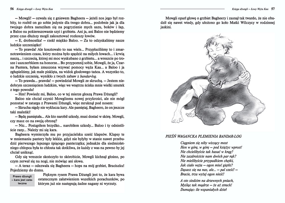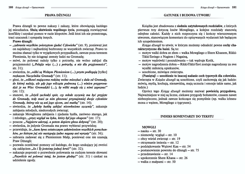 Wydanie Księgi dżungli kompletne bez skrótów i cięć w treści. W tym wydaniu znajdziesz odpowiedzi na pytania z podręcznika - „pewniak na teście”, czyli wskazanie zagadnień, które zwykle pojawiają się w pytaniach z danej lektury we wszelkich testach sprawdzających wiedzę, a także w podręcznikach i na klasówkach. Książka zawiera pełen tekst lektury. Na końcu książki zamieszczono opracowanie, w którym znajduje się bardzo szczegółowe streszczenie oraz drugie skrócone, ułatwiające szybkie przygotowanie się przed lekcją. Opracowanie zawiera ponadto plan wydarzeń, wnikliwie wyjaśnioną problematykę oraz szerokie charakterystyki bohaterów.
