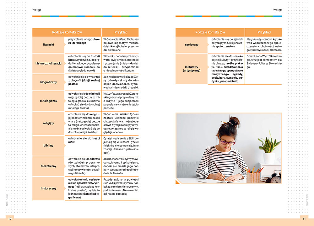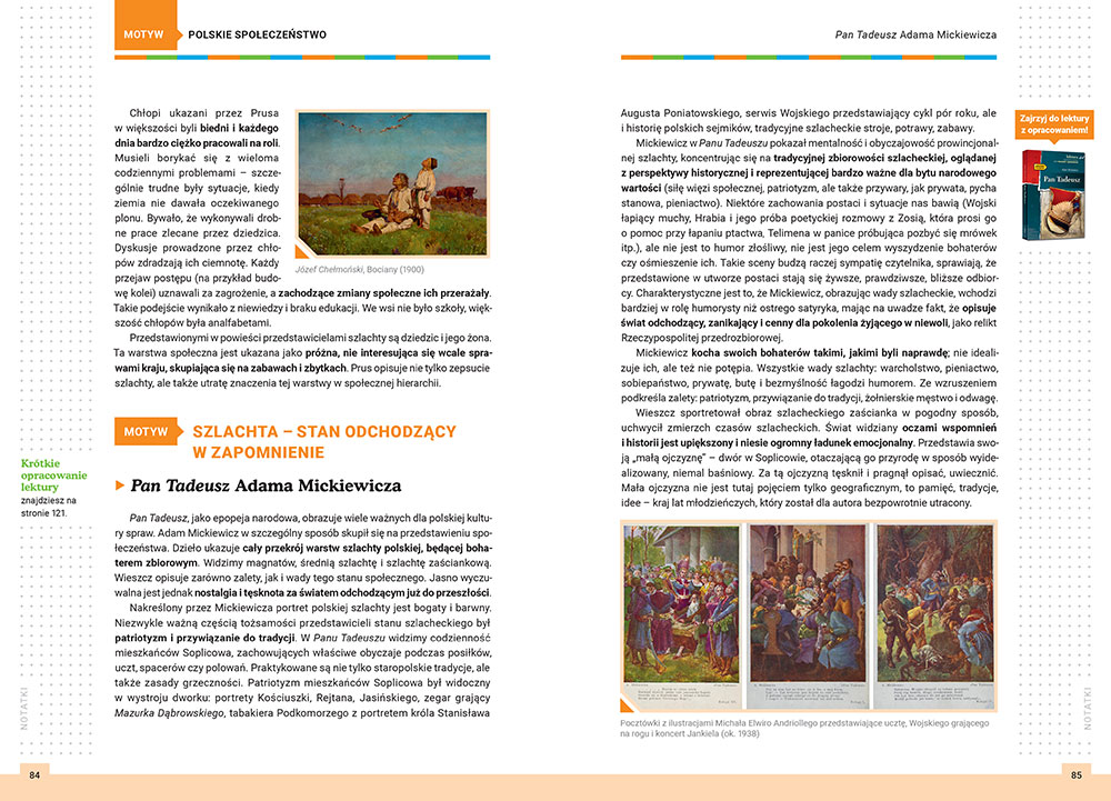 W książce omówiono między innymi motywy: dorastania, historii, ludowości, miłości, moralności i śmierci. Opracowano przy tym takie lektury jak Pan Tadeusz Adama Mickiewicza, Zemsta Aleksandra Fredry czy Opowieść wigilijna Karola Dickensa.
