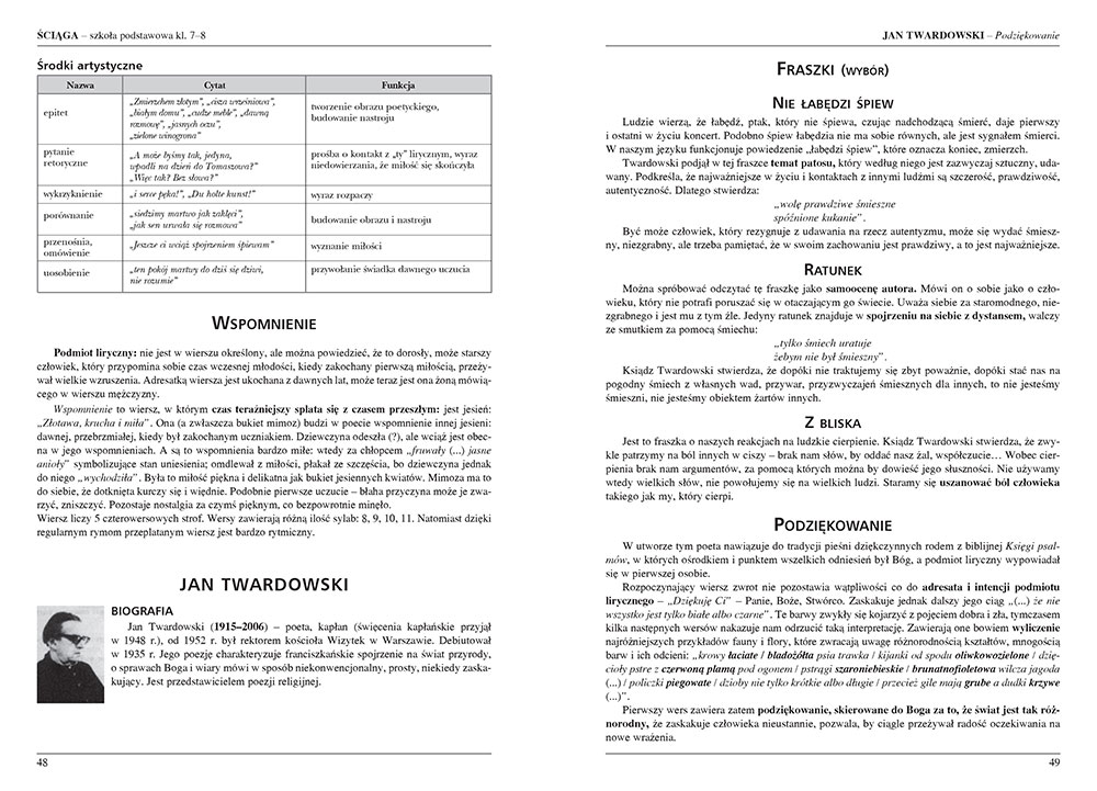Ściąga przeznaczona dla klas 7-8 zawiera opracowania wszystkich obowiązkowych w tych dwóch latach nauki lektur i wierszy. Można tu znaleźć biografię autora, plan wydarzeń, dokładne charakterystyki bohaterów, szczegółowe streszczenia i wyczerpującą problematykę każdego utworu, a w przypadku wierszy także omówienia ich budowy. Wszystko przedstawiono przystępnym językiem, który sprawia, że praca z książką jest łatwa i przyjemna.